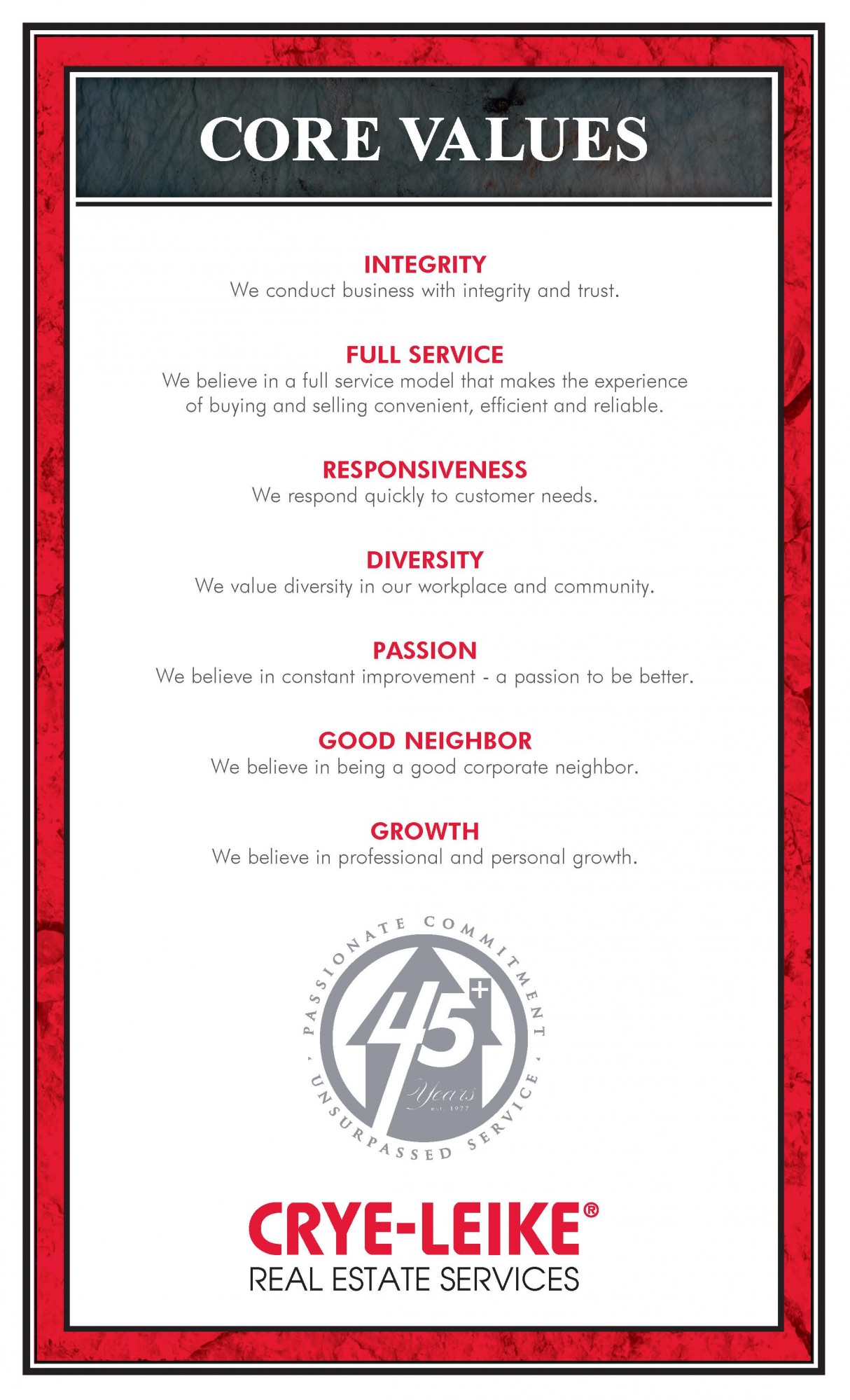 It starts with our owners. Harold Crye and Dick Leike. They founded Crye-Leike in 1977 with a passion to exceed expectations and they still focus on this every day.